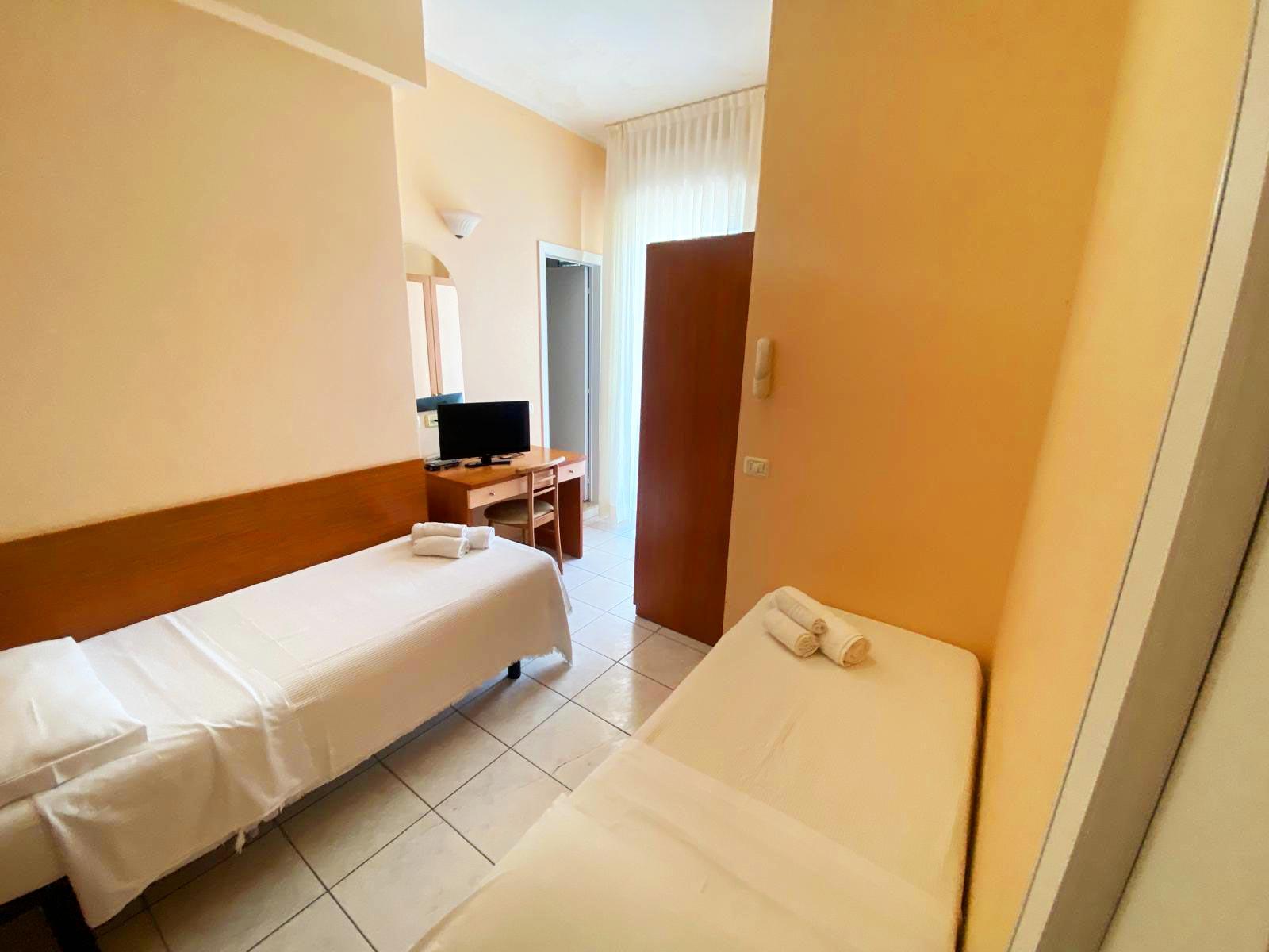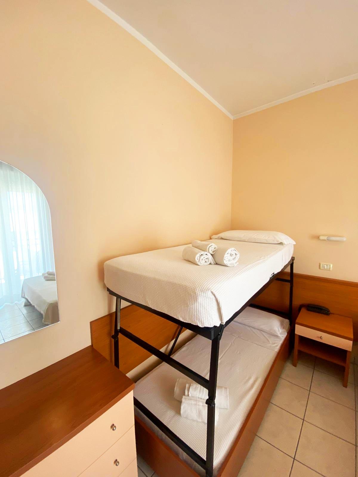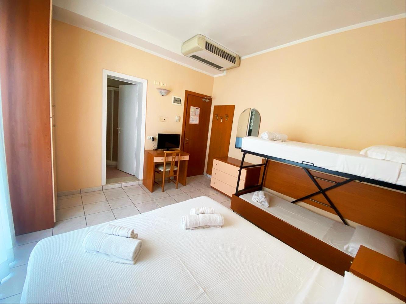 Perfect for families or larger groups, the quadruple room offers four comfortable beds and plenty of space to move around freely. Equipped with a private bathroom, Wi-Fi, air conditioning, and a TV, it ensures comfort and convenience throughout your holiday. Its proximity to the sea and Riccione's main amenities makes it the ideal solution for enjoying the best of the Adriatic Riviera without sacrificing convenience.