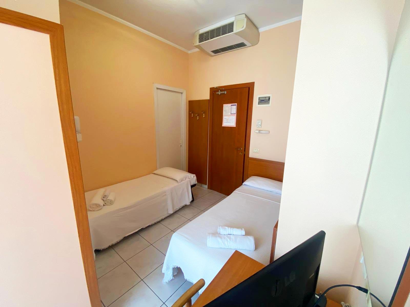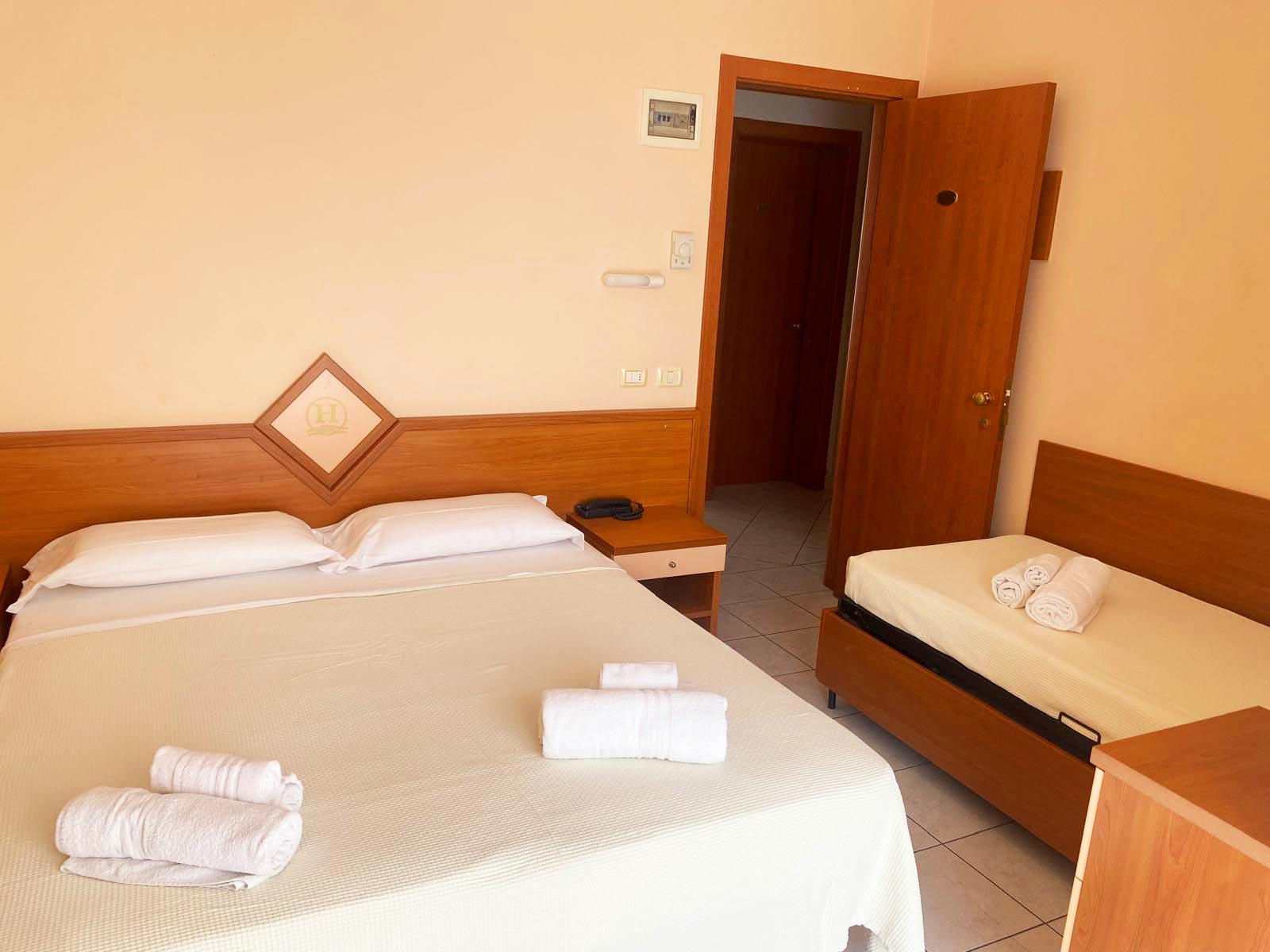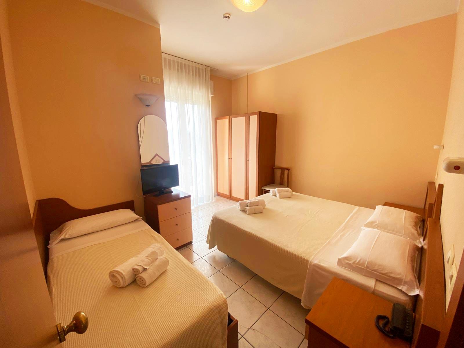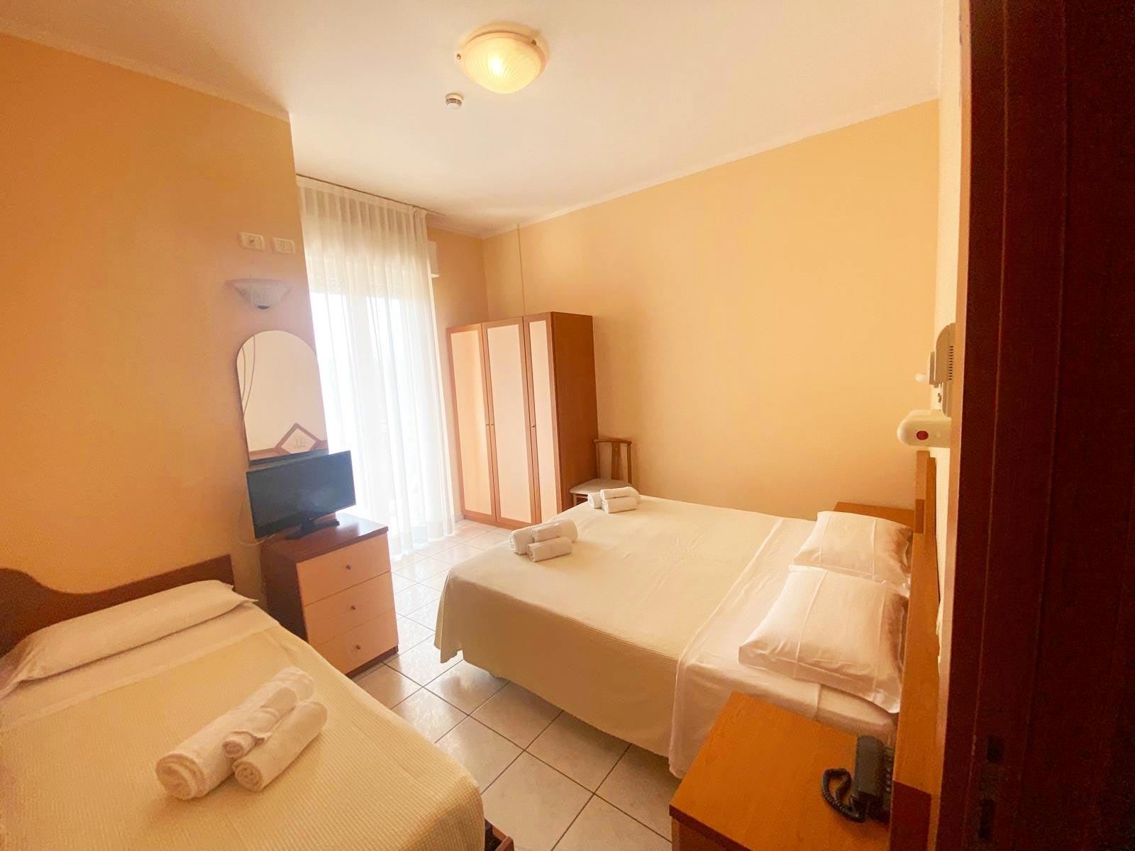 Ideal for small families or groups of friends, the triple room offers three comfortable beds in a spacious and functional space. It includes a private bathroom, Wi-Fi, air conditioning, and a TV, providing everything you need for a pleasant stay. Its strategic location just meters from the sea allows you to fully enjoy your Riccione holiday, combining beach, fun, and relaxation.