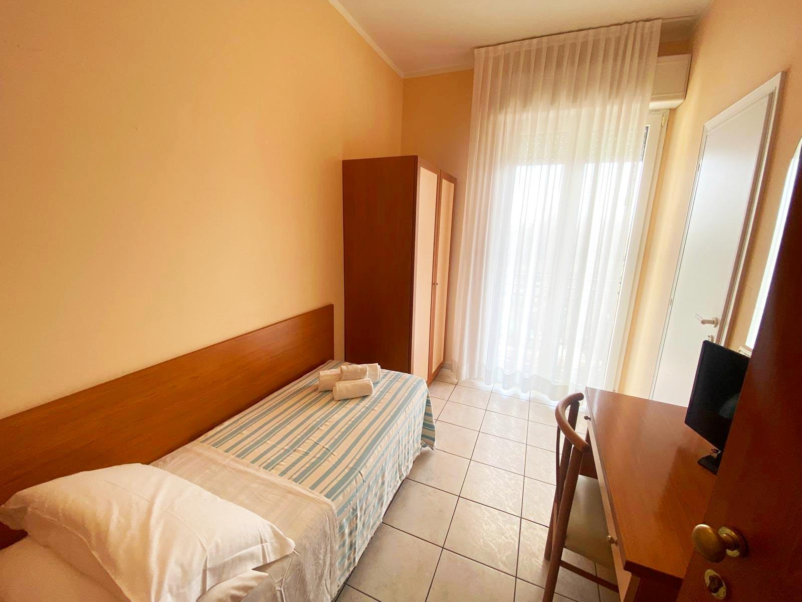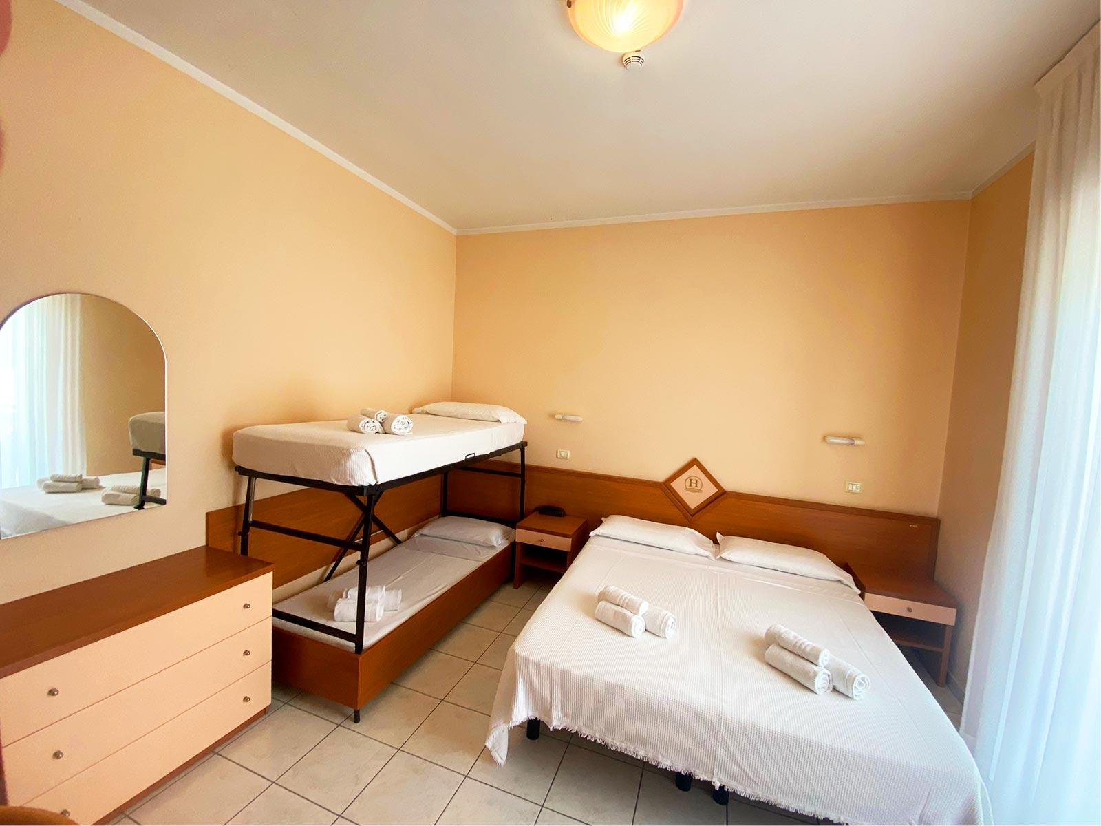Perfect for families or larger groups, the quadruple room offers four comfortable beds and plenty of space to move around freely. Equipped with a private bathroom, Wi-Fi, air conditioning, and a TV, it ensures comfort and convenience throughout your holiday. Its proximity to the sea and Riccione's main amenities makes it the ideal solution for enjoying the best of the Adriatic Riviera without sacrificing convenience.